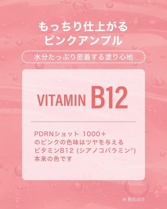 また、美容液のピンク色はツヤを与えるビタミンB12(シアノコバラミン※7)そのものの色です。濃厚な美容液がしっかり美容成分と潤いを届け※5、もっちりハリツヤのある肌に導きます。