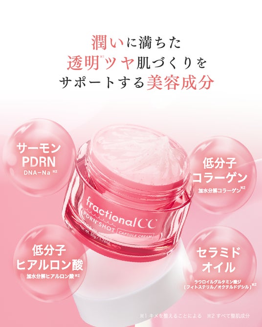 スキンラボ株式会社(東京都中央区)が展開する"美容医療発想""から生まれたメイドインジャパンのダーマコスメブランド「フラクショナルCC」は、肌の透明感※3を管理するトーニング※3ラインとして「PDRNショット 1000+」と「PDRNショット カプセルクリーム」を2025年2月末より順次発売いたします。本シリーズは、美容医療で注目されている「サーモンPDRN※1(Polydeoxyribonucleotide:ポリデオキシリボヌクレオチド)」を配合、肌細胞※5に働きかけ、透明感※3のあるハリつや肌を実現します。