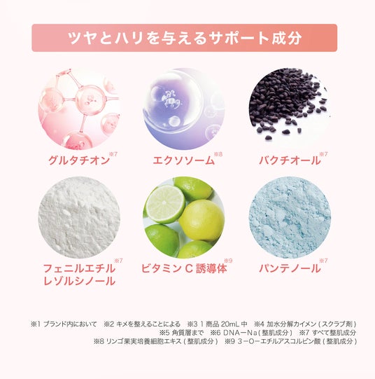 さらに、ツヤとハリを与えるサポート成分として、グルタチオン※7、エクソソーム※8、バクチオール※7も配合。生まれ変わったような透明感※3のある素肌へ導きます。