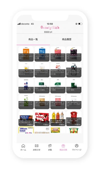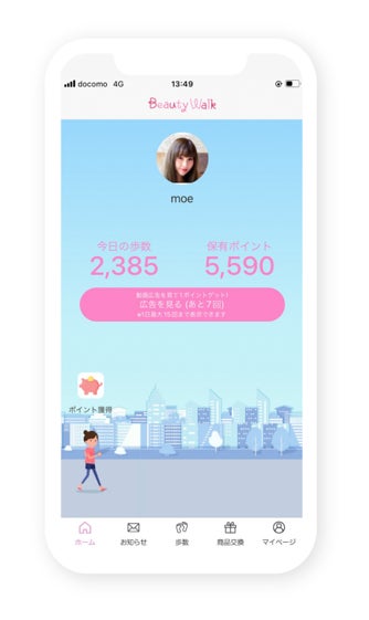 「ビューティーウォーク」は、歩いたり、ミニゲームなどで貯めたポイントを人気コスメなどに交換できる美容版ポイ活アプリです。韓国コスメから有名ブランドのスキンケアまで様々な交換アイテムを取りそろえることで、10-20代の女性ユーザーを中心に多くの支持をいただいています。