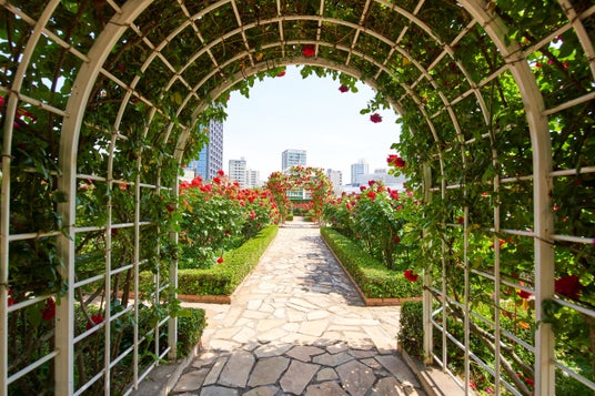 ホテルニューオータニ(東京)のレッドローズガーデンは、英国王室御用達の世界的フローラルデコレーター ケネス・ターナー氏監修のもと、2000年11月に屋上緑化の一環として誕生しました。春と秋の年2回、30種3万輪もの赤薔薇が咲き誇る景色は圧巻の美しさで、多くのお客さまに親しまれています。これから咲き始める春薔薇は、花の大きさと色の鮮やかさが特徴です。特に庭園の中心にあるガゼボを覆うツル薔薇も開花し、レッドローズガーデン全体を華やかに彩ります。