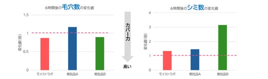 塗布直後を1として塗布直後と6時間後の毛穴とシミの変化値を毛穴・シミカバー力として評価