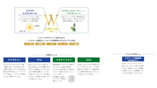 今回発売する「ダーマ&ボタニカル」の2アイテムには、浸透性※1に優れたカプセル化ピュアレチノールに加え、"次世代レチノール"と称される植物由来のバクチオールを高配合。