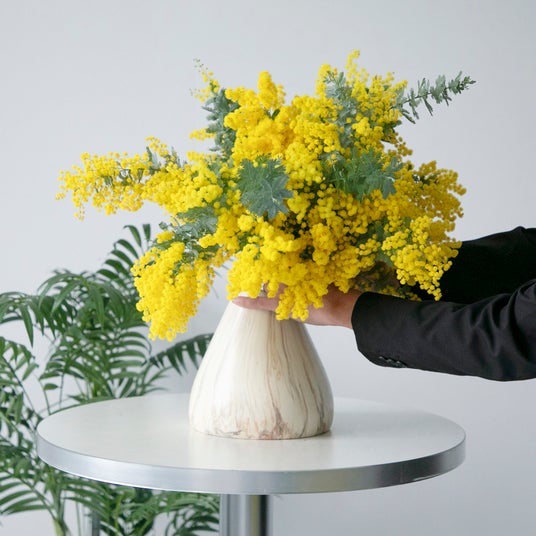 フラワーベースで存在感たっぷりのミモザを楽しんで
