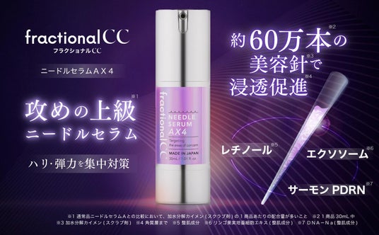 スキンラボ株式会社(東京都中央区)が展開する"美容医療発想"から生まれたメイドインジャパンのダーマコスメブランド「フラクショナルCC」は、「ニードルセラムAX4」の発売を開始いたします。本製品は通常品の「ニードルセラムA」の4倍の美容針※2を配合した上級※4ニードルセラムです。約60万本※1の美容針※2に加え、レチノール※3、エクソソーム※6、話題の美容成分サーモンPDRN※7など、多数の美容成分を掛け合わせた、ハリ弾力を集中対策したい方におすすめのニードル美容液です。