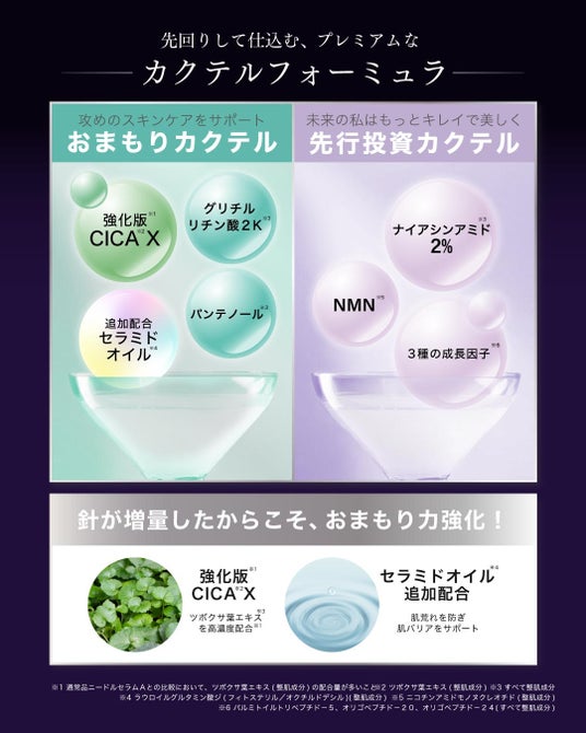 美容針※2を4倍に増量したからこそ、通常品ニードルセラムAに比べ、お守り力を強化しました。肌を整える2%ナイアシンアミド※3に加え、強化版※10 CICA X※11、セラミドオイル※12などを贅沢配合。乾燥・肌荒れを防ぎ、なめらかで引き締まった印象の肌へ導きます。