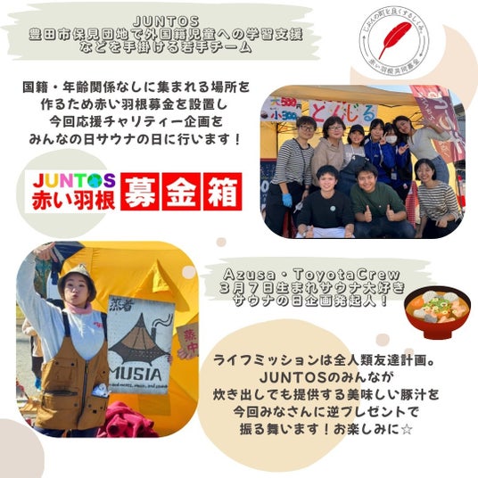 このイベントは、地域の活性化と国際交流を深めることを目的としており、参加者はサウナを楽しみながら、地域貢献にも参加できる特別な機会です。豊田市で活動する「JUNTOS」の多文化共生プロジェクトへの支援を目的に、赤い羽根募金を実施します。募金箱は店頭に設置され、イベント参加者は自由に寄付ができます。