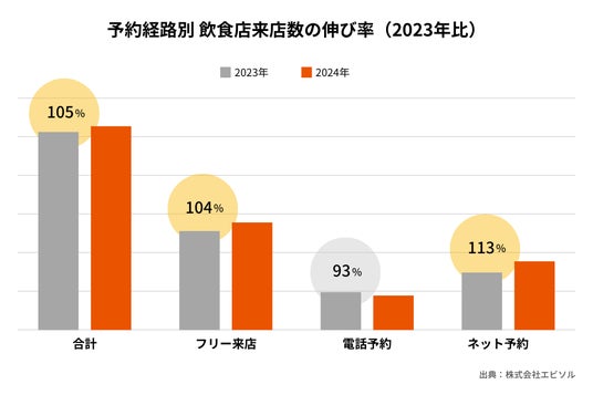 1. 2024年は飲食店への来店数が2023年比105%に増加。電話予約は減少した一方でネット