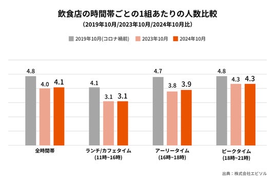 2024年10月の1組あたりの平均来店人数は、4.1人となりました。2019年10月の4.8人と比べると減少しているものの、2023年10月の4.0人と近い数字になり、堅調に推移しています。ランチ/カフェタイム(11時~16時)、アーリータイム(16時~18時)、ピークタイム(18時~21時)といった時間ごとのデータにおいても概ね同じ傾向となりました。これは、アフターコロナの動向として、法人や学生サークルなどによる大型の宴会利用が減少し、少数グループによる宴席が定着したことが伺えます。グループサイズに関してはコロナ禍以前のサイズには戻らない一方で、上記のように来店数は伸びていることから、外食需要は引き続き活況を呈すると考えられます。