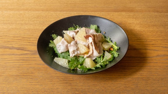 アグー豚の旨みをシンプルに引き出す、しゃぶしゃぶサラダ。ポン酢にごま油を合わせることで香ばしい味わいに仕上げました。ゴロっと入った柑橘フルーツの爽やかな酸味がアグー豚の甘味を引き立てます。