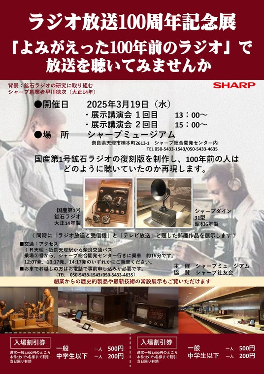 シャープは、展示施設シャープミュージアム(奈良県 天理市)にて、本年3月19日(水)に「ラジオ放送100周年記念展-よみがえった100年前のラジオで放送を聴いてみませんか-」を開催します。
