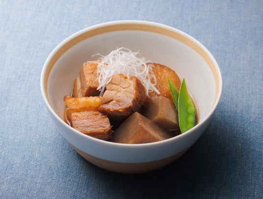 豚バラ肉、大根、蒟蒻をかつお節だしの効いた甘めの汁で仕上げました。じっくり煮込んだ豚肉は箸でほぐれるほど柔らかく、甘辛い味わいがご飯との相性抜群です。