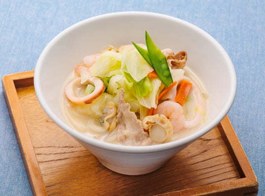 鶏白湯とかつお節だしの味わい深いスープに、野菜、海鮮、豚肉の旨みを合わせたうどんです。具材の旨みが溶け込んだスープと、もちもちのうどんが絶妙に絡み合う満足感のある一杯です。