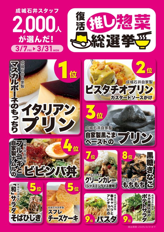 株式会社成城石井(本社事務所:神奈川県横浜市西区北幸、代表取締役社長:後藤勝基)は、「成城石井スタッフ2,000人が選んだ!復活"推し惣菜"総選挙!!」を2025年3月7日(金)から3月31日(月)まで、成城石井の全店で開催いたします。