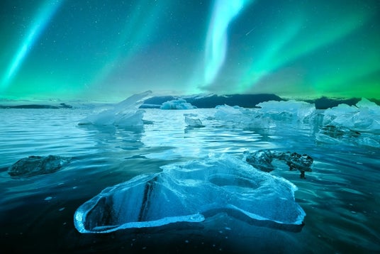 氷山が浮かぶ幻想的な湖。冬限定で楽しめる、夜空を彩るオーロラとのコラボレーションには思わずうっとり。