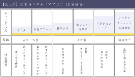 「板前オープンスクール」和食コースでは4月から中期的な板前育成キャリアプランを構築して教育体系を整備いたします。「板前オープンスクール」の6か月間を含めた3年間の「板前3年キャリアプラン」を採用します。3年間のカリキュラムを設けて、和食業態では代表的な料理であるふぐを扱えるふぐ調理師免許取得を目指します。カリキュラムには、板前カウンター修行や海外板前修業といった内容も含めました。「板前オープンスクール」が「板前として海外で働いてみたい」といった夢を抱いていることを受けたもので、実際に海外で板前として働くことができる機会を設ける計画です。