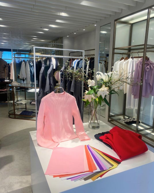 店舗内に(株)島精機製作所のホールガーメントテクノロジーを導入し、サプライチェーン不要ですべて自社で生産が完結する洋服作りを行っている。