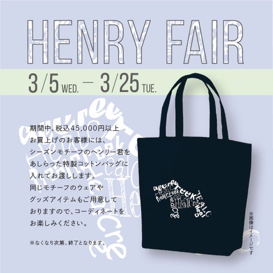期間中、税込45,000円以上お買いあげのお客様には、シーズンモチーフのヘンリー君をあしらった特製コットンバッグに商品を入れてお渡しします。