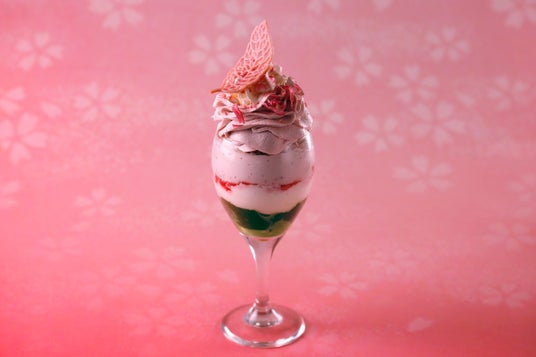 さくら餡を練り込んで作るコクのあるレアチーズムースをベースに、エディブルフラワー、さくらチュイルを添えた、春爛漫の新作パフェ『さくらの春色パフェ』。