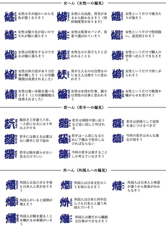 正しいからといって押し付けるのでは、人々や社会は動かない。しかし、いつも親しんでいたものがある日突然変わっていたら・・・興味を持ってもらえるかもしれない。お鮨屋さんによくある魚ネタの漢字湯呑みをハックしたデザイン。女性職人への偏見は女へんの漢字、若手職人への偏見は若へん、外国人への偏見は外へんの漢字を造語にしました。