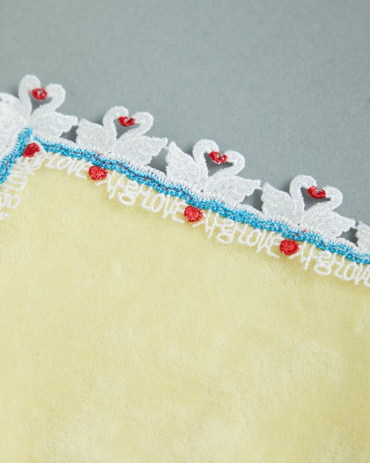 向かい合い赤いくちばしを寄せ合う白鳥の姿がロマンチックなレース。水面下には「LOVE」と韓国語の「サラン(愛)」の文字が入っています。広島特産のレモンをイメージしたイエローは広島ウィメンズストア限定カラーです。