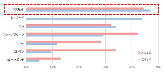 ・人気No.1フレーバー「清涼感」や「爽快感」においてご好評をいただいている天然水ゼリーですが、2023年、2024年とフレーバー調査を行った結果、2年連続でマスカットが第1位を獲得しました。今年はようやくマスカット風味を発売できるようになりましたので、多くのお客さまにご飲用いただければ幸いです。