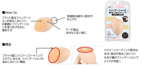 3D形状タイプはフラット面をシリコーンコーティングすることで、ファンデーションが染みこみにくい特殊構造。フラット面は化粧下地やファンデーションを薄くのばしやすく、先端は細かい部分の仕上げやアーチ面は顔全体に使用できます。