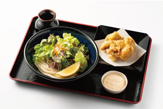 「うどん」のモチモチ、「鶏天」のサクサク、「生野菜」のシャキシャキと、食べ進めるたびに変化していく食感もお楽しみいただける「鶏天タルタルうどん」。「うどん」は「温」と「冷」が選べるので、気温が変化しやすい季節の変わり目にもピッタリのメニューとなっています!