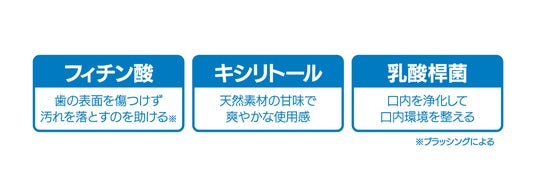 歯の汚れを落とすのを助ける*³「フィチン酸」、口内環境を整える「乳酸桿菌」、爽やかな使用感をもたらす「キシリトール」の3大成分を配合。さらに、アルコールフリーのため刺激が少なく、毎日のオーラルケアに最適です。