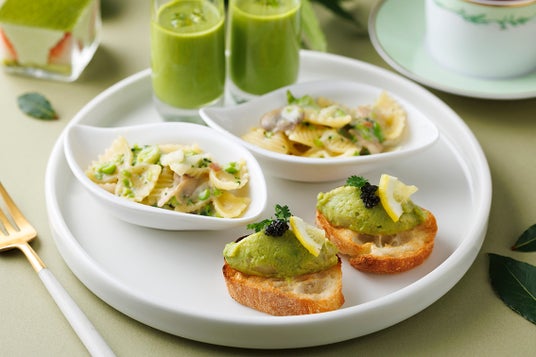 全体を彩り豊かなグリーンでまとめたセイボリーには、「ファルファッレ 春野菜の菜園風」をはじめ、アボカドや枝豆などを使った冷製スープ「緑のガスパチョ」、帆立とアボカドを滑らかなペーストに仕上げた「帆立とアボカドのブルスケッタ」を。
