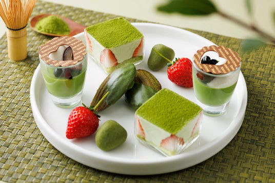 苺の断面が美しい「苺・抹茶の豆腐ティラミス風」やコクのある味わいの「抹茶ブランマンジェ」、抹茶の香り漂う「抹茶マドレーヌ」。
