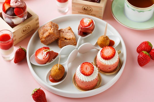 苺ソースを包み込んだまろやかな苺のレアチーズムースに、さらに苺のチョコレートをコーティングした見た目も可愛らしい「苺レアチーズムース」。外はサクッと香ばしく、中はしっとりとした「苺スコーン」。そして、「苺・生ハム・ブッラータチーズのカプレーゼ」、「鱈のブニュエロス」などもご用意。