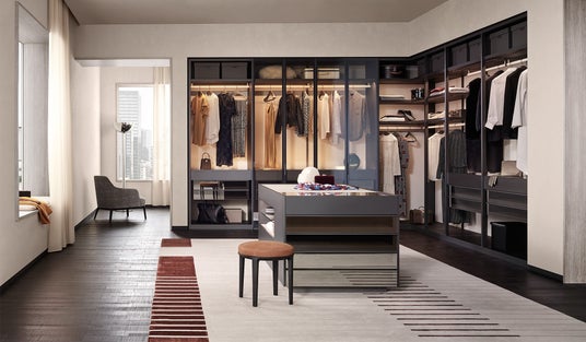 ウォークインクローゼットやワードローブ空間を優雅に引き立てるために、ロドルフォ・ドルドーニがデザインしたアイランド型の収納ユニット「Set up(セットアップ)」は、ガラストップとディスプレイしながら収納できるオープンコンパートメントが特徴で、ウォークインクローゼットのセンターピースとして空間をエレガントに演出いたします。