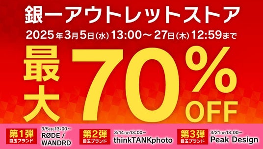【楽天 銀一アウトレットストア】3月5日(水)~3月27日(木)の期間限定で、最大70%オフのセールを実施!日程別に目玉ブランドをご用意し、撮影機材やカメラバッグがお買い得に!!
