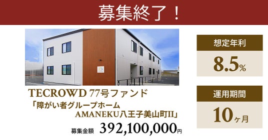 【想定年利8.5%】不動産クラウドファンディング「TECROWD」、国内開発型ファンド障がい者グループホーム AMANEKU八王子美山町II」を投資対象とするファンド募集終了