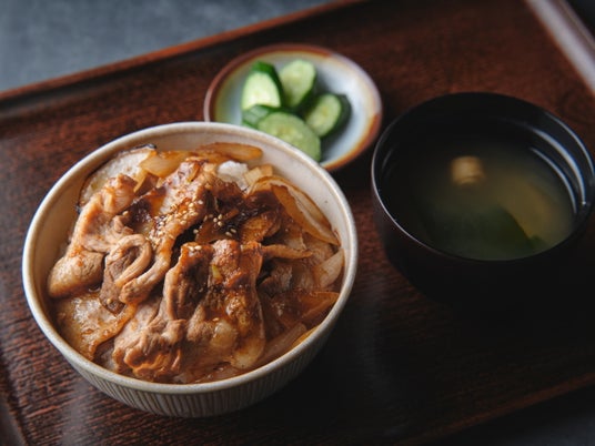 『茶美豚リブロース』と甘みのある玉ねぎを上出来特製生姜焼きタレで焼き上げ、石川県産100%こしひかりと一緒にかきこめる、豪快などんぶり。