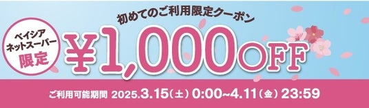 「ベイシアネットスーパー」で初めてお買い物をされるお客様限定で、3月15日(土) より1,000円OFFクーポンをプレゼントいたします。
