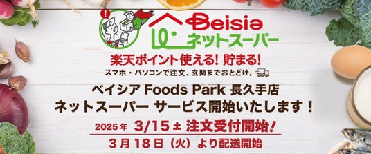 株式会社ベイシア(本社:群馬県前橋市、代表取締役社長:相木孝仁)は、楽天グループ株式会社が提供するネットスーパーのプラットフォーム「楽天全国スーパー」内に出店する「ベイシアネットスーパー」において、ベイシア Foods Park 長久手店からの配送を2025年3月18日(火)より開始いたします。
