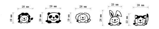 顔だけだと動きがなく寂しい、全身を入れると3cm未満の中では顔が小さくなり過ぎて何か分かりづらいと悩んだ結果、今回の下の穴から動物達がぴょこっと顔を覗かせているようなデザインをしました。このデザインにすることで、顔を最大限の大きさにして分かりやすいまま、穴や手・尾を付けることで動きを出しました。