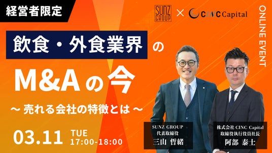 【株式会社CINC】子会社のCINC Capitalによる飲食・外食業界の経営者向けセミナー『飲食・外食業界の「M&Aの今」 ~売れる会社の特徴とは?~』開催のお知らせ