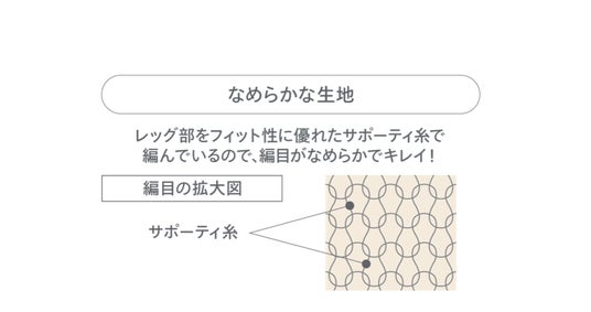 穴が開いても伝線が拡がりにくい糸のゾッキ編みを採用しています。生地面が美しく伸びがよく、肌にフィットする履き心地です。