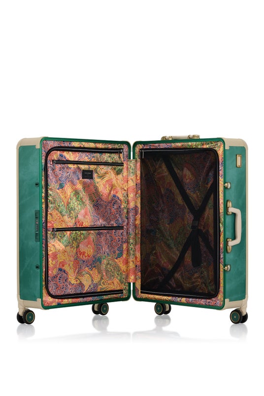 内装生地は鮮やかなペイズリー柄のプリントがほどこされており、バッグを開けた際の特別なモーメントを体験いただけます。また、衝撃を吸収し安定した機動性を発揮するボールベアリング内蔵のサスペンションホイールや、荷物の整理収納に便利なパッキングキューブ、ラゲッジカバー、レザー製ラゲッジタグ、シリアルナンバーが刻まれたフレームには刻印が可能なレザータグも付属するなどリッチな仕様となっています。