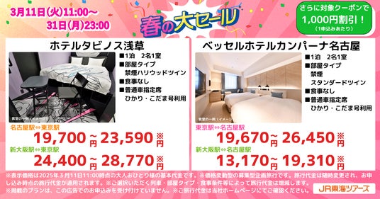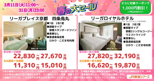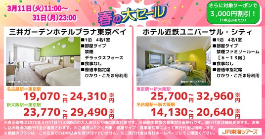 株式会社ジェイアール東海ツアーズ(本社:東京都中央区、以下JR東海ツアーズ)は、2025年3月11日(火)11時から3月31日(月)23時までEX旅パック「春の大セール」を開催します。今回のセールは、2025年5月7日(水)出発から2025年7月18日(金)帰着の旅行が対象です。往復新幹線と誰もが一度は泊まってみたいラグジュアリーホテルやコスパ重視ホテルの選べるホテルがセットになったEX旅パックを、期間限定のセール価格で予約ができるチャンス!さらに、EX会員情報にLINEアカウントを連携すると、セール価格からさらに最大3,000円割引となるキャンペーンも実施します。この機会をお見逃しなく!