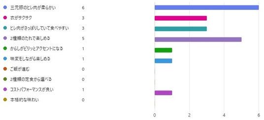 最も多くの票を集めたのは『三元豚のヒレ肉が柔らかい』というポイントでした。2位は『2種類のたれで楽しめる』、3位は『衣がサクサク』、『ヒレ肉がさっぱりしていて食べやすい』でした。