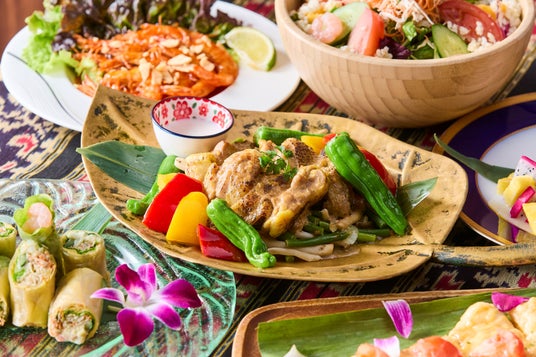 春の歓送迎会にぴったり、30~40種のドリンクも飲み放題。サラダや揚げ物、ナシゴレン、デザートまで、大満足の全8品。お肉とスパイスの旨みが味わえる、鶏のルンダンは絶品です。