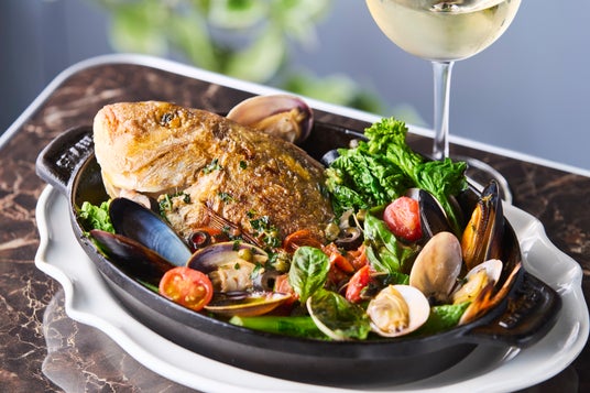 ふっくらとした天然鯛の身に、ほろ苦い菜の花がアクセント。まるごと使った鮮魚のダシ、アサリの旨みがとけだしたアクアパッツァは格別の味わい。〆にはリゾットがおすすめ。