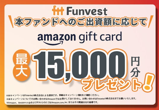 本ファンドへ出資していただいた投資家の皆様を対象として、出資額に応じて最大15,000円分のAmazonギフトカードをプレゼントするキャンペーンも併せて実施いたします。