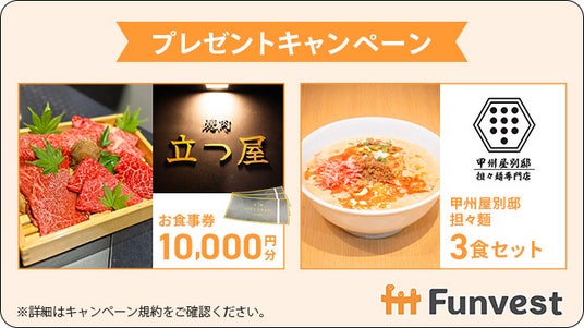 【A賞】400万円以上の出資でもれなく焼肉立つ屋 お食事券(10,000円相当)をプレゼント!