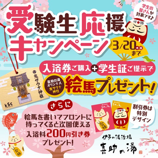 受験生を応援する企画として2025年3月20日(木)まで学生を対象にキャンペーンを開催しています。入浴券の購入後フロントで学生証を提示すると鬼サウナ神社絵馬をプレゼントします。更に絵馬を書いてフロントに持ってくると、次回使える入浴200円引券をプレゼントします。割引券は、合格祈願・必勝を祈る特別デザインです。
