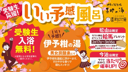四国最大級の総合エンターテイメント企業・キスケ株式会社(本社:愛媛県松山市、代表:山路義則)の運営する温浴施設「喜助の湯」は受験生の皆さんに、合格への道を応援する特別企画が登場します!3月14日(金)から3月16日(日)の3日間、『いい予感風呂』が開催されます。このイベントは、受験生の合格を祈願し、リラックスして合格発表に臨むためのものです。期間中、受験票を提示することで入浴料が無料になりますので、この機会にぜひお立ち寄りください。 伊予柑の湯で心身ともにリフレッシュし、合格へのいい予感を感じていただくことを願っています。受験生の皆さんが最後まで諦めず、力を発揮できるよう願っております。